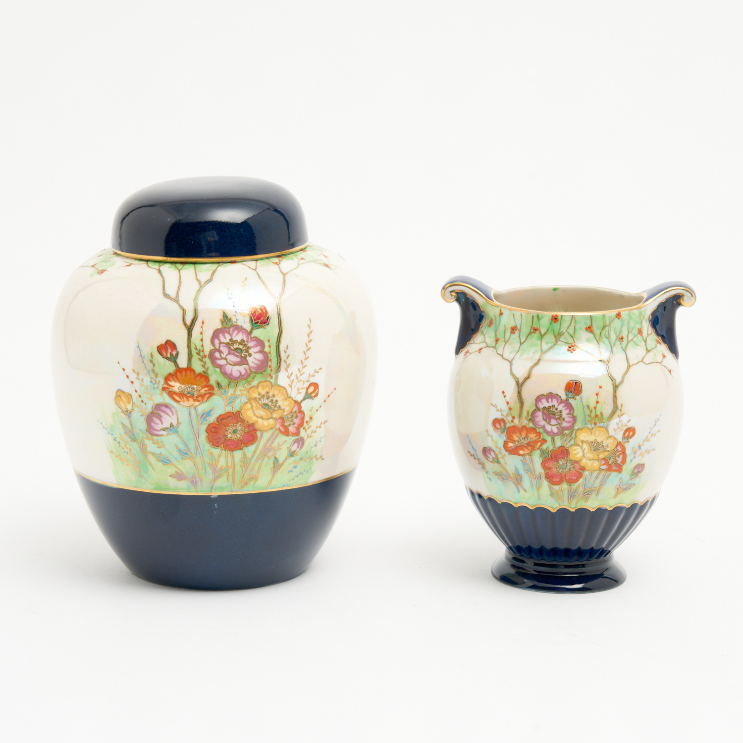 A CROWN DEVON FIELDINGS HANDPAINTED VASE AND GINGER JAR H.18CM (TALLEST)