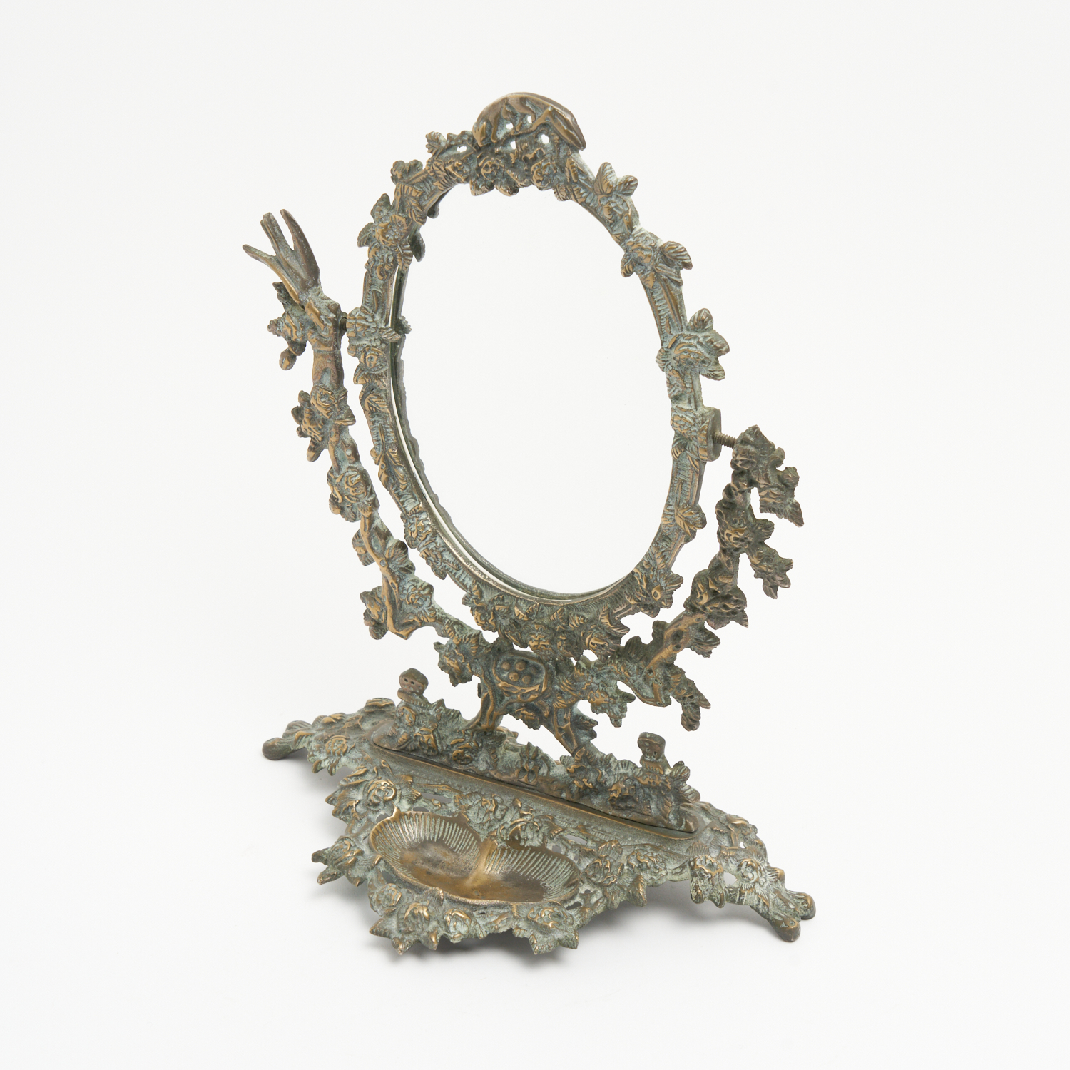 AN EARLY 20TH CENTURY FRENCH CAST BRONZE DRESSING TABLE MIRROR DECORATED WITH BIRD AND FOLIAGE H.34CM