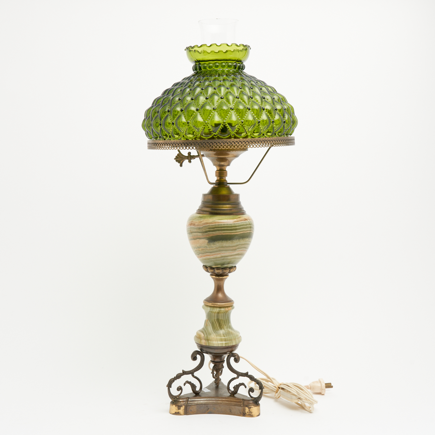 A VINTAGE ITALIAN BRASS AND MARBLE BASED KEROSENE FORM ELECTRIC LAMP H.70CM