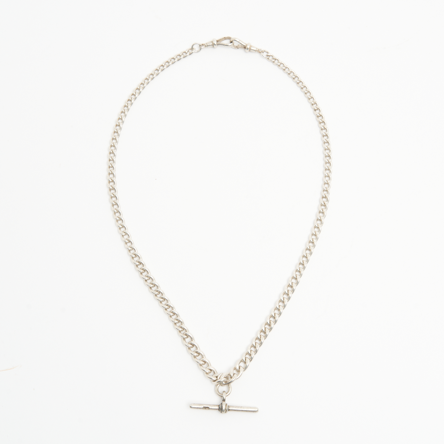 AN ENGLISH HALLMARKED STERLING SILVER LONG FOB CHAIN NECKLACE, HALLMARK TO EVERY LINK L.48CM