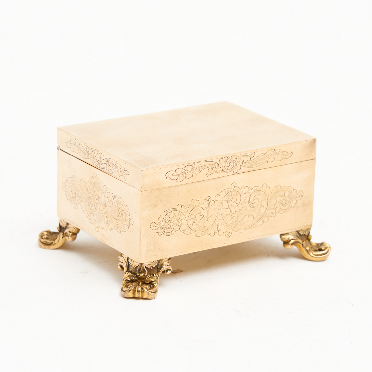 AN ANTIQUE FRENCH TWIN LIDDED GILT BRONZE ENGRAVED CASKET BOX L.8.5CM