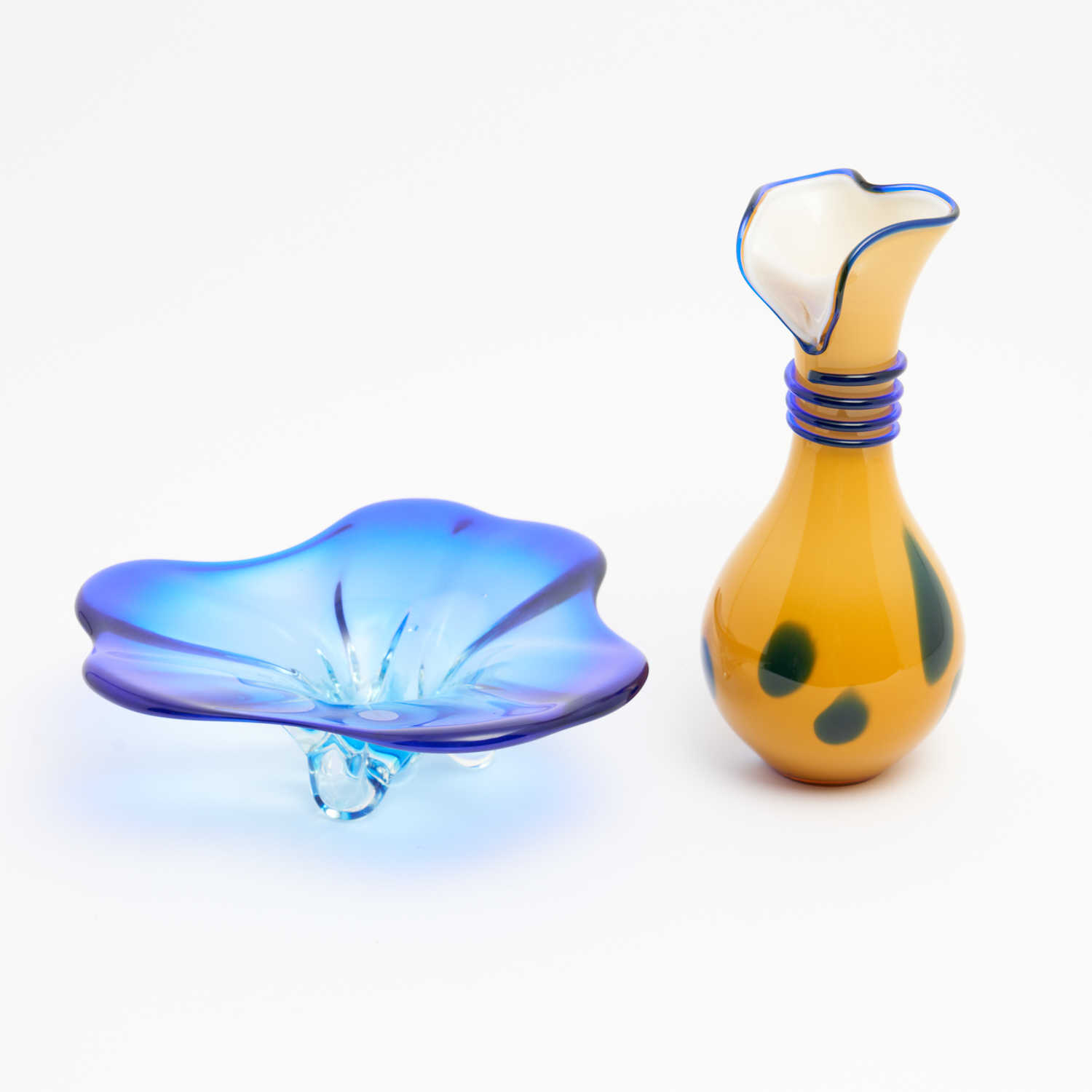TWO PIECES OF ART GLASS INCLUDING A BOWL IN BLUE AND A YELLOW AND BLUE VASE H.32CM