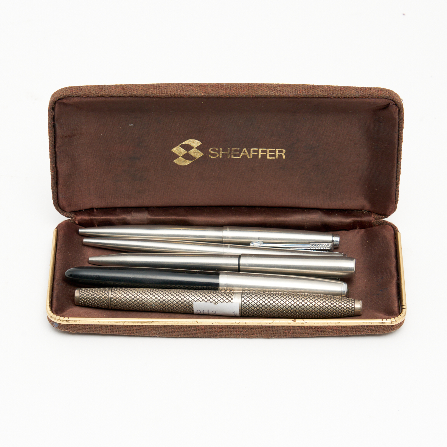 A COLLECTION OF PENS INCUDING A STERLING SILVER SHAEFFER FOUNTAIN PEN WITH 14 CARAT GOLD NIB, AND FOUR PARKER PENS