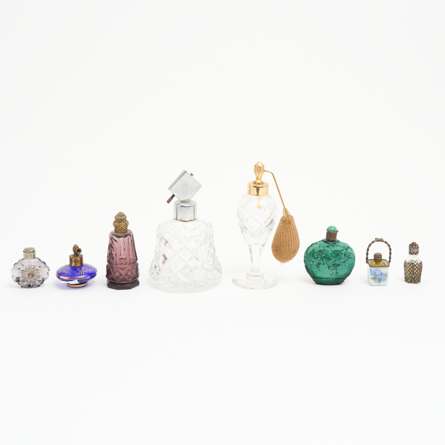 A COLLECTION OF PERFUME BOTTLES AND ATOMIZER INCLUDING BRIERLEY AND LIMOGES H.15CM (TALLEST)