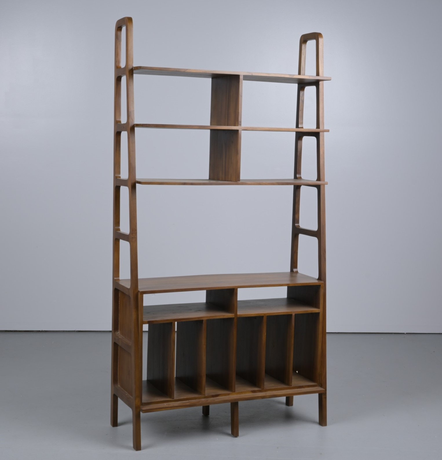 A CONTEMPORARY TEAK BOOKCASE WITH RECORD STORAGE (190CM H X 100CM W X 35CM D) (THIS ITEM MUST BE REMOVED BY PROFESSIONAL CARRIERS OR CLIENTS. LEONARD JOEL STAFF CANNOT ASSIST WITH CARRYING OR DELIVERY OF THIS ITEM)