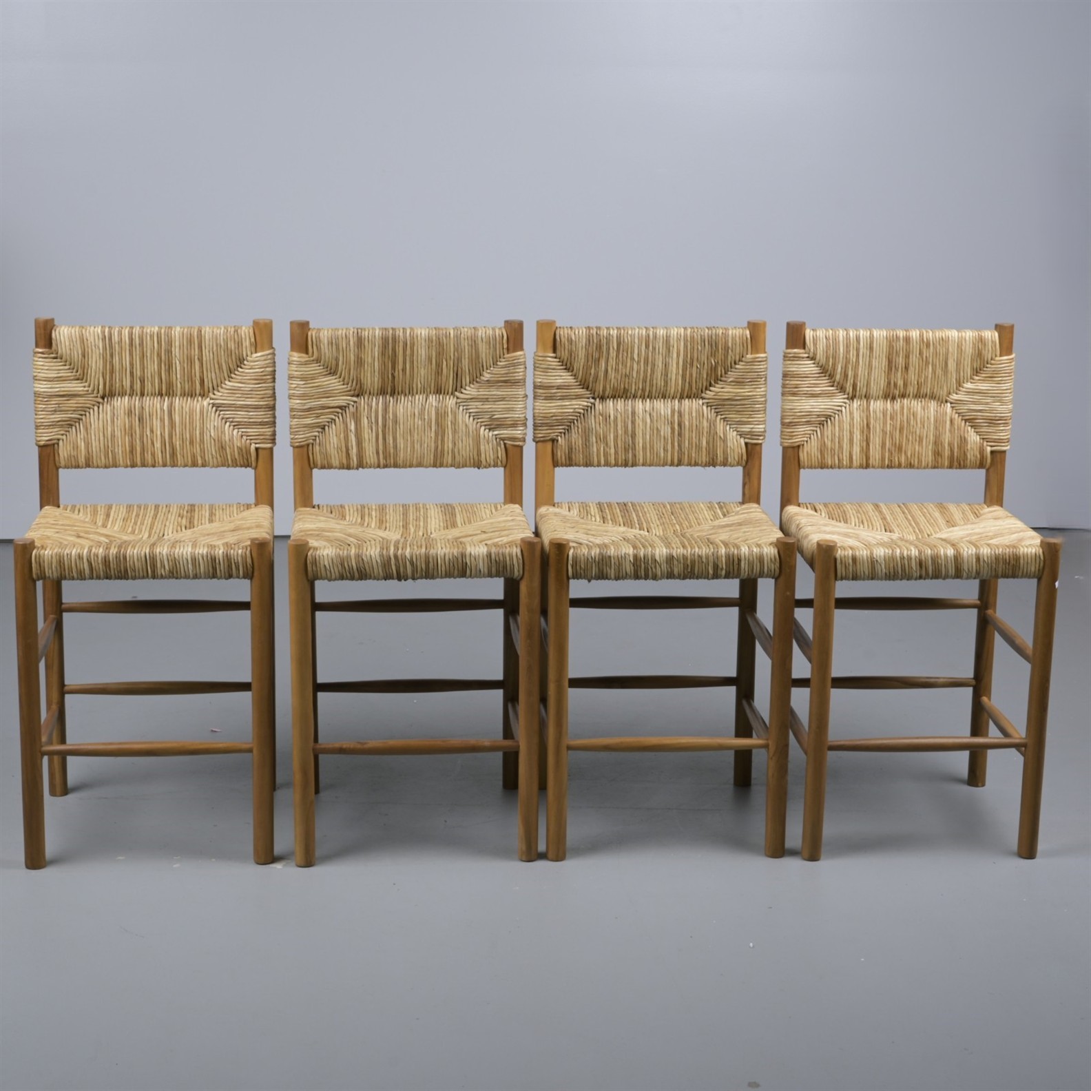 A SET OF FOUR TEAK AND SEAGRASS COUNTER STOOLS (102H X 48W X 46D CM)