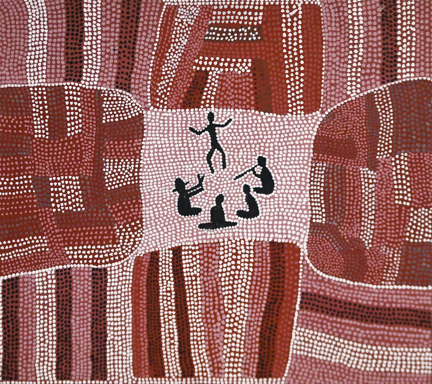 NATURAL EARTH PIGMENTS AND SYNTHETIC POLYMER PAINT ON LINEN, INSCRIBED VERSO WITH ARTIST'S NAME AND JIRRAWUN ARTS CENTRE INFORMATION, 122 X 135CM