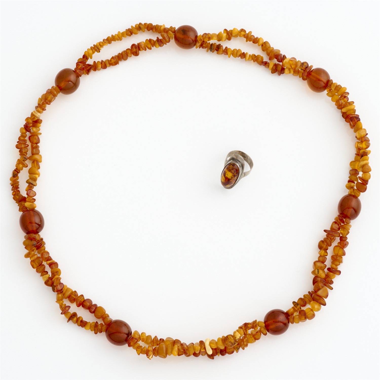 A SUITE OF AMBER JEWELLERY, INCLUDING A STRAND OF AMBER BEADS, 600MM, AND AN AMBER RING IN SILVER, SIZE O