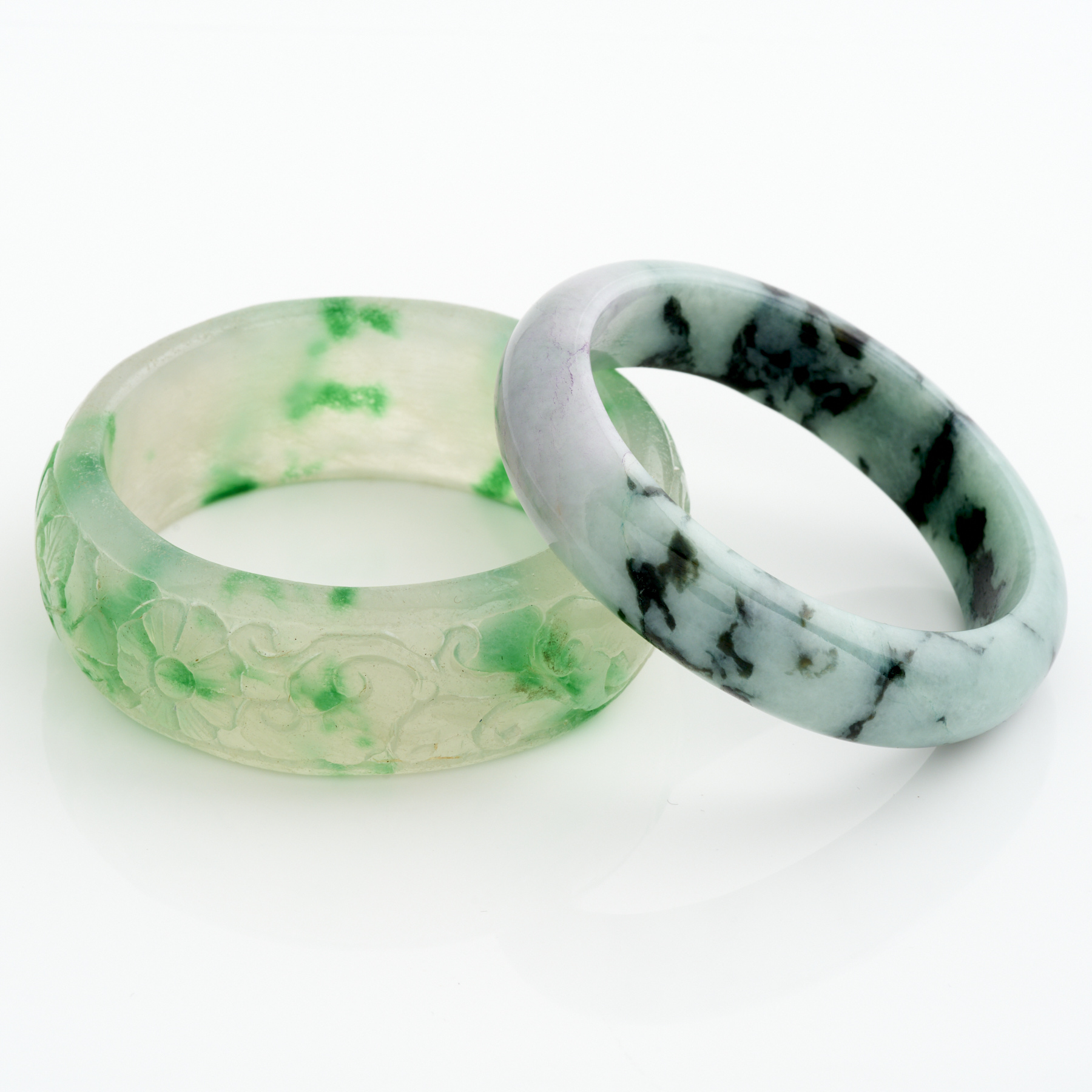 A DYED JADE BANGLE TOGETHER WITH A JADE BANGLE, THE LARGEST INNER DIAMETER MEASURING 65MM