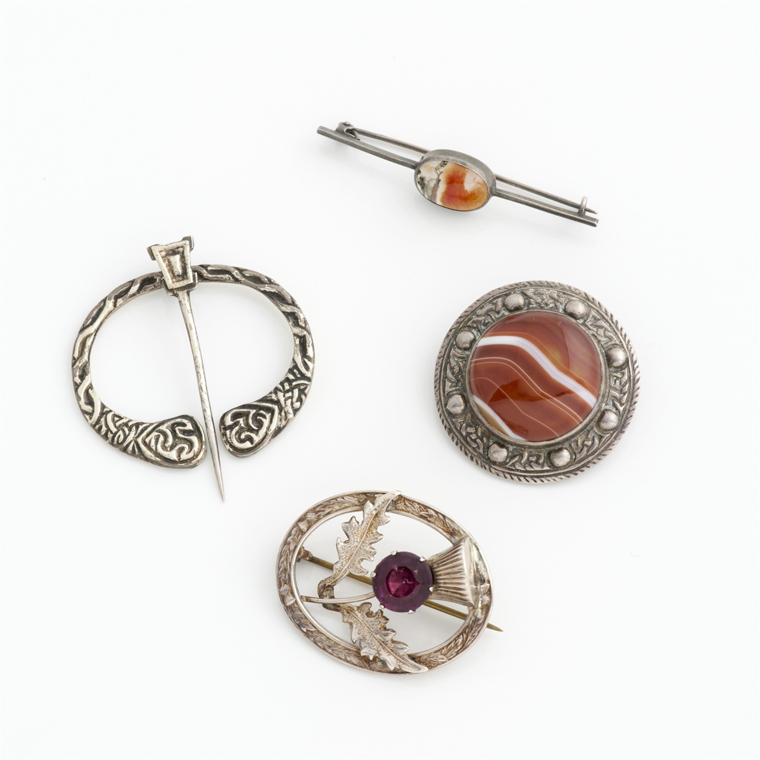 A GROUP OF FOUR AGATE, AMETHYST AND QUARTZ BROOCHES IN STERLING SILVER, THE LARGEST MEASURING 45MM X 40MM