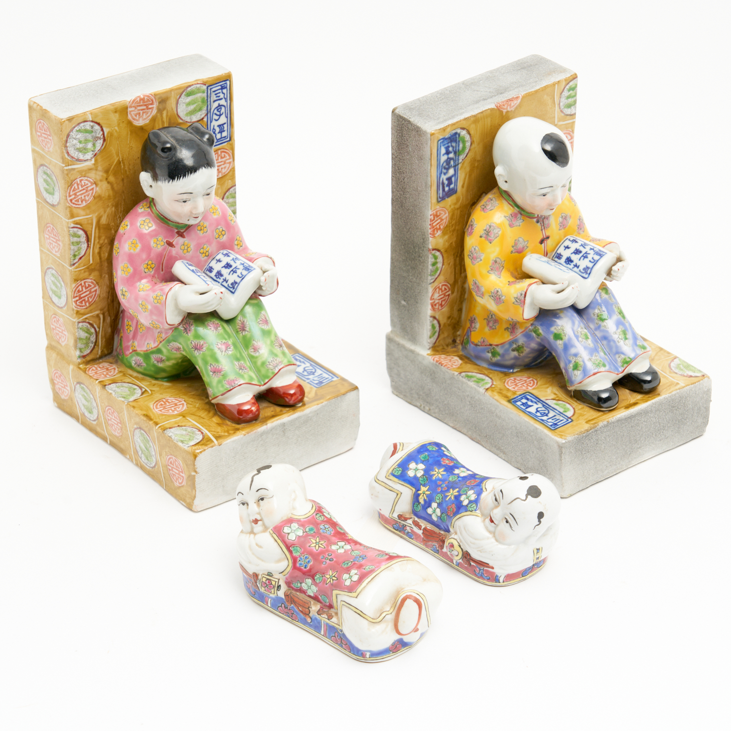 A PAIR OF CHINESE PORCELAIN FIGURAL BOOKENDS TOGETHER WITH A PAIR OF PORCELAIN PILLOWS H.23CM (TALLEST)