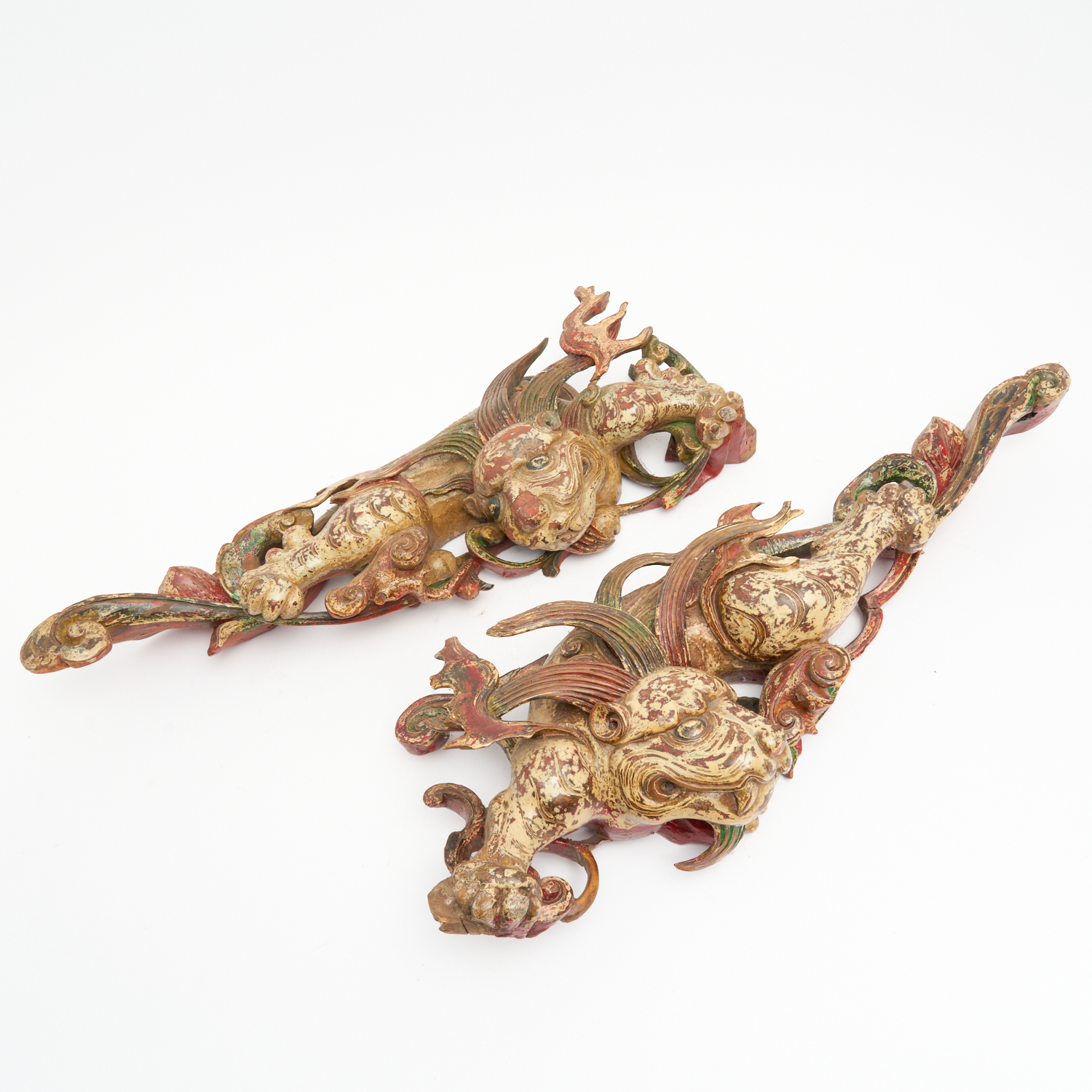 A MIRRORED PAIR OF CHINESE CARVED POLYCHROME GUARDIAN LION FIXTURES (REPAIRS) L.54CM