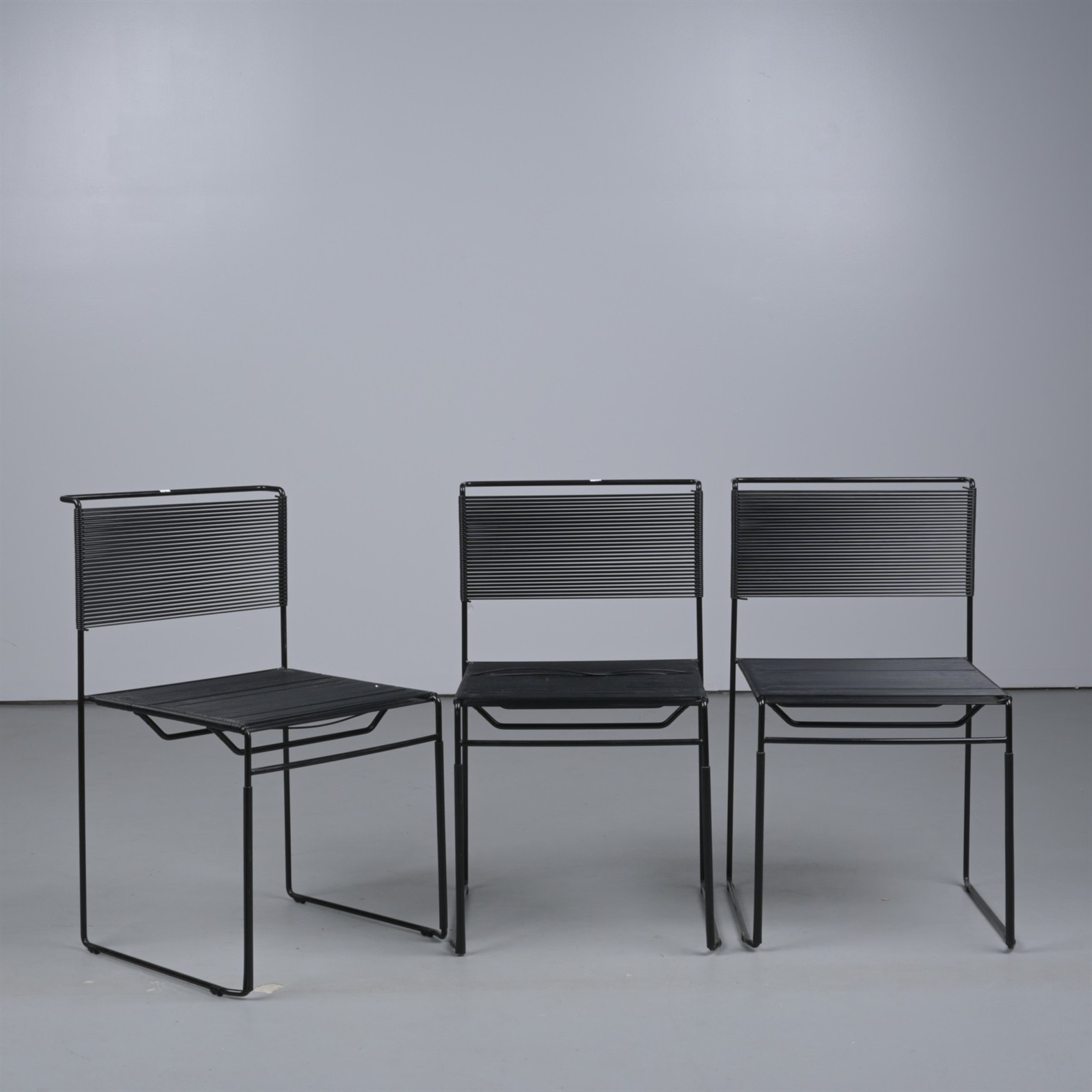 A SET OF THREE BLACK METAL CHAIRS (A/F) (81CM H X 47CM W X 50CM D)
