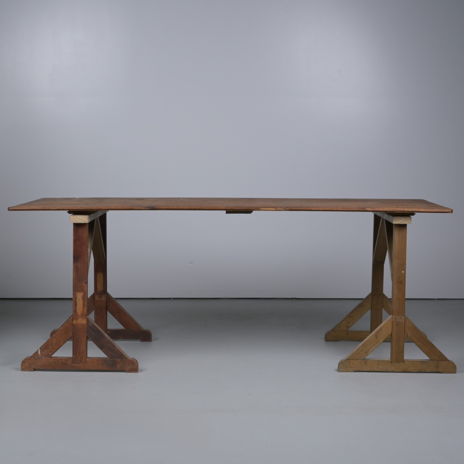 A PINE TRESTLE TABLE (86CM H X 226CM W X 80CM D) (THIS ITEM MUST BE REMOVED BY PROFESSIONAL CARRIERS OR CLIENTS. LEONARD JOEL STAFF CANNOT ASSIST WITH CARRYING OR DELIVERY OF THIS ITEM)
