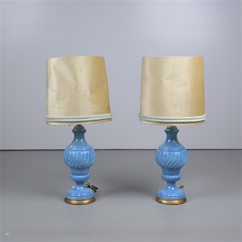 A PAIR OF TURQUOISE PORCELAIN TABLE LAMPS (117CM H X 55CM D)