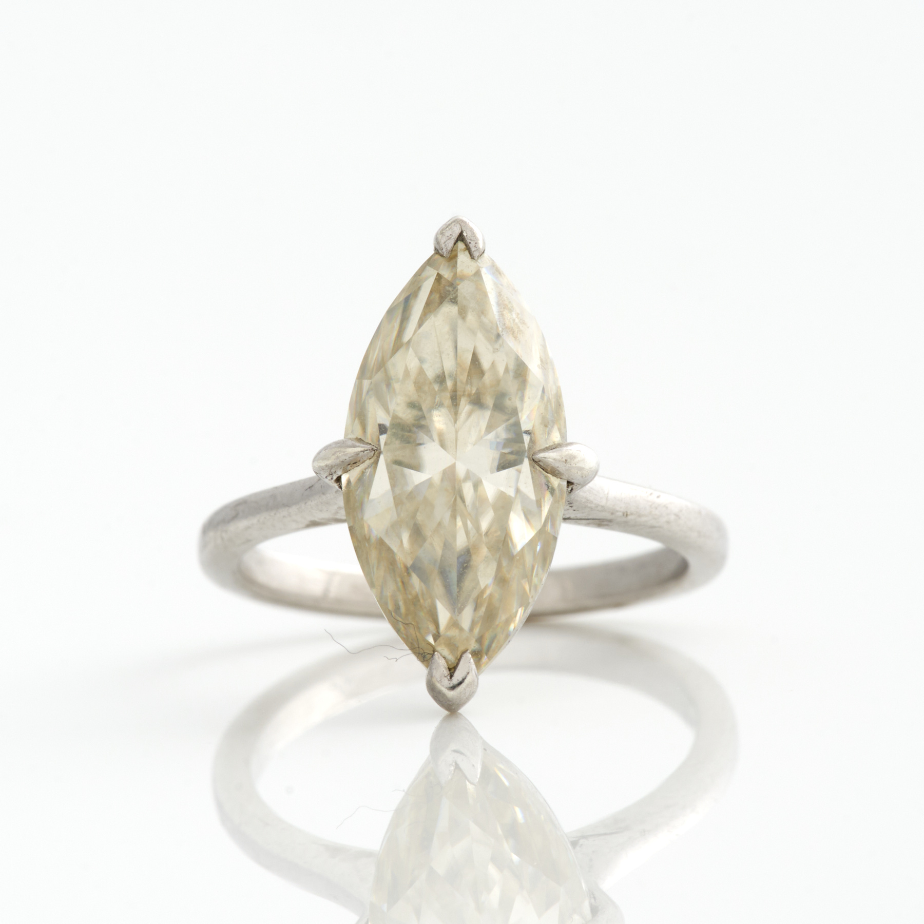 A MOISSANITE RING IN 14CT WHITE GOLD, THE MOISSANITE WEIGHING APPROXIMATELY 3.00CTS, SIZE J 1/2, 2.8GMS