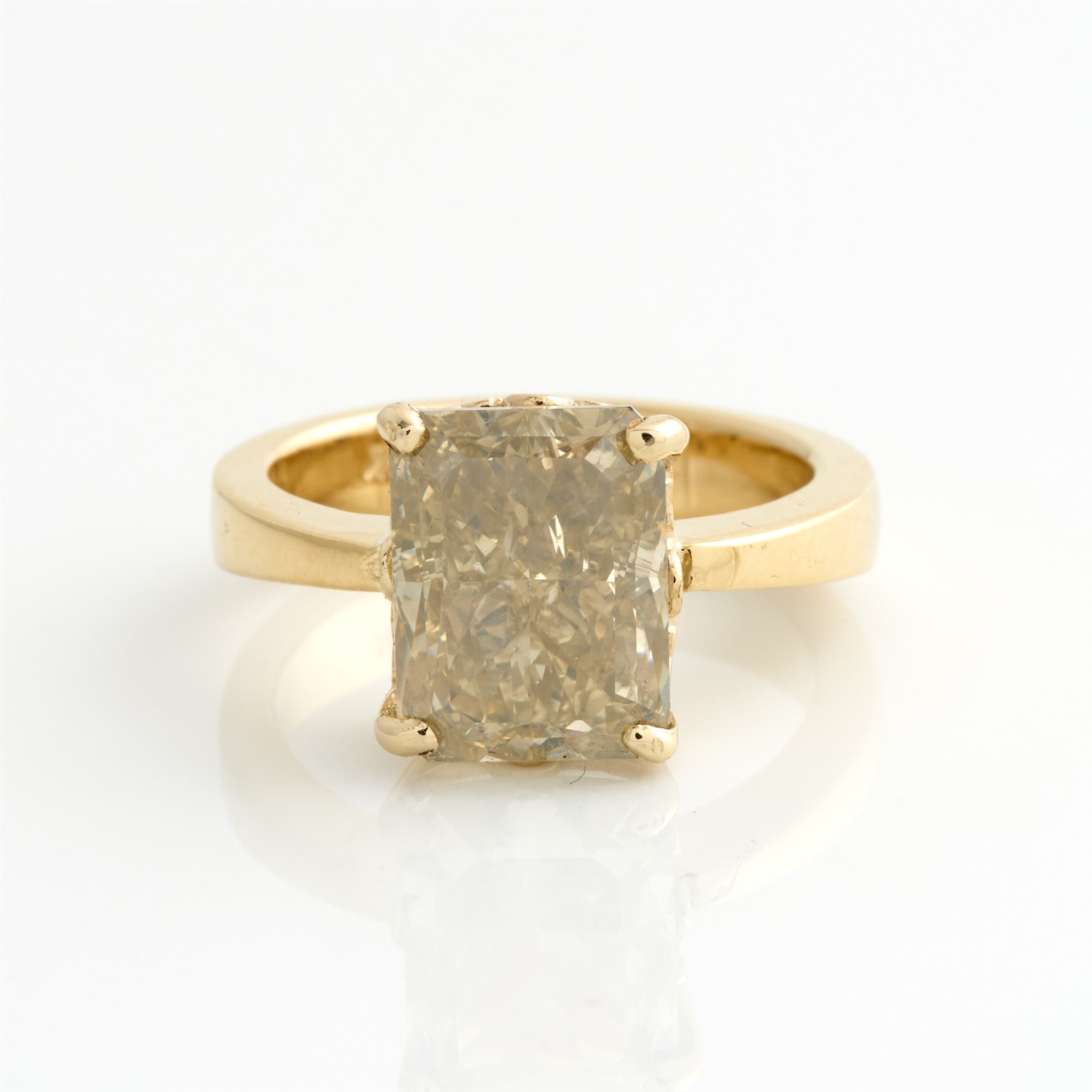 A FANCY LIGHT YELLOWISH-BROWN DIAMOND RING IN 18CT GOLD, THE DIAMOND WEIGHING 5.50CTS, SIZE K 1/2, 6.96GMS, ACCOMPANIED BY A VALUATION