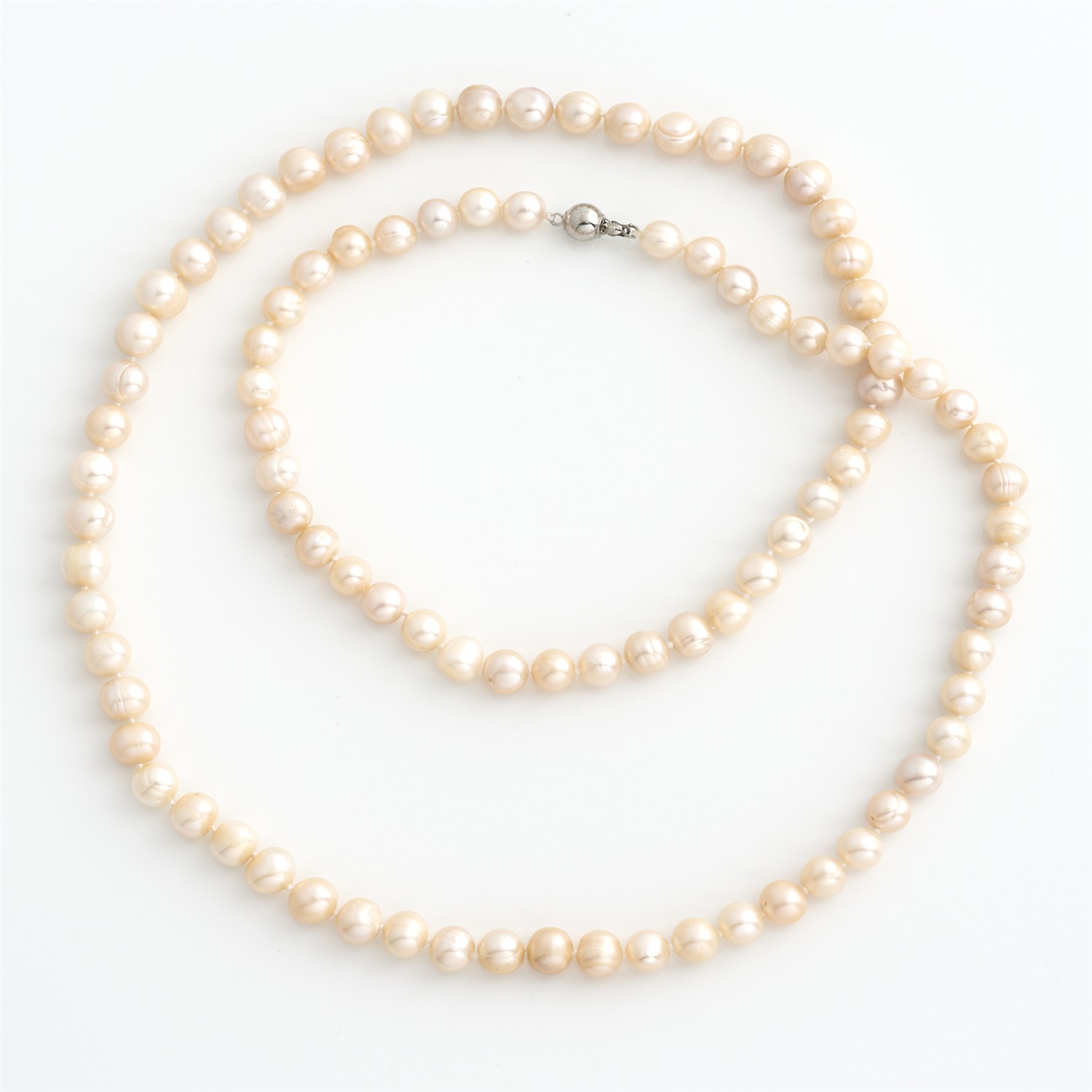 A STRAND OF FRESHWATER PEARLS TO A CLASP IN SILVER, 860MM