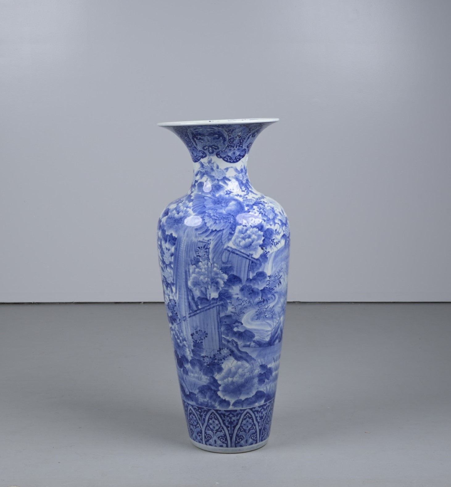 A LARGE JAPANESE GLAZED CERAMIC BLUE AND WHITE VASE (110CM H X 44CM W) (THIS ITEM MUST BE REMOVED BY PROFESSIONAL CARRIERS OR CLIENTS. LEONARD JOEL STAFF CANNOT ASSIST WITH CARRYING OR DELIVERY OF THIS ITEM)