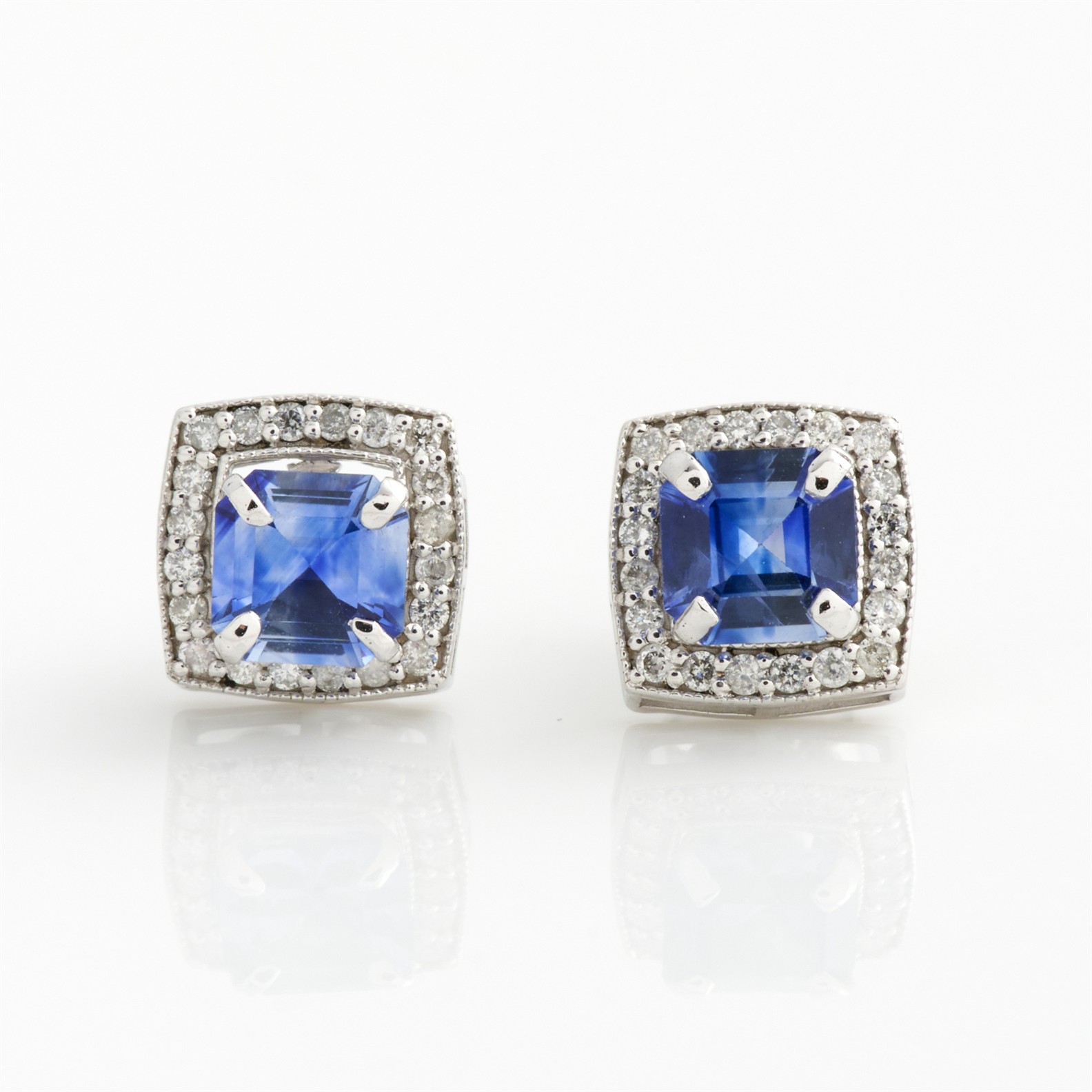 A PAIR OF CEYLONESE TYPE SAPPHIRE STUD EARRINGS, WITH REMOVABLE DIAMOND ENHANCERS, IN 18CT WHITE GOLD, TO POST AND BUTTERFLY FITTINGS, TOTAL WEIGHT 2.59GMS