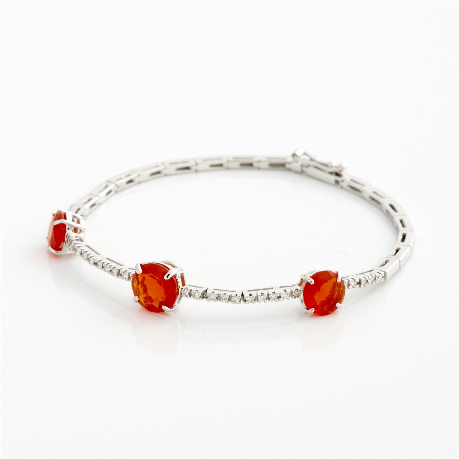 A MEXICAN FIRE OPAL AND DIAMOND BRACELET IN 14CT AND 18CT WHITE GOLD, INNER DIAMETER 55MM, TOTAL WEIGHT, 9.7GMS