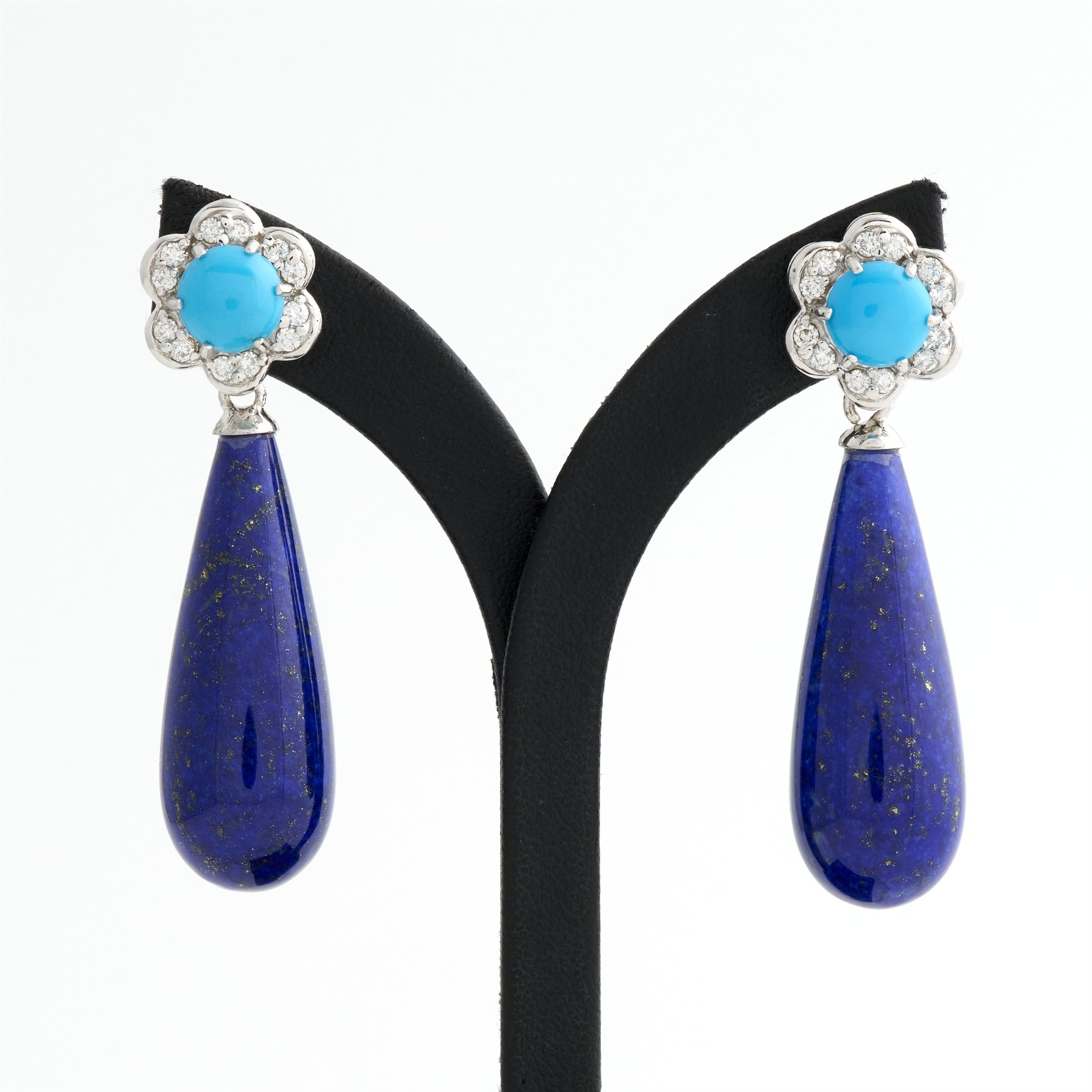 A PAIR OF A LAPIS LAZULI, TURQUOISE AND DIAMOND EARRINGS IN 18CT WHITE GOLD, THE DIAMONDS WEIGHING APPROXIMATELY 0.80CT, 55MM