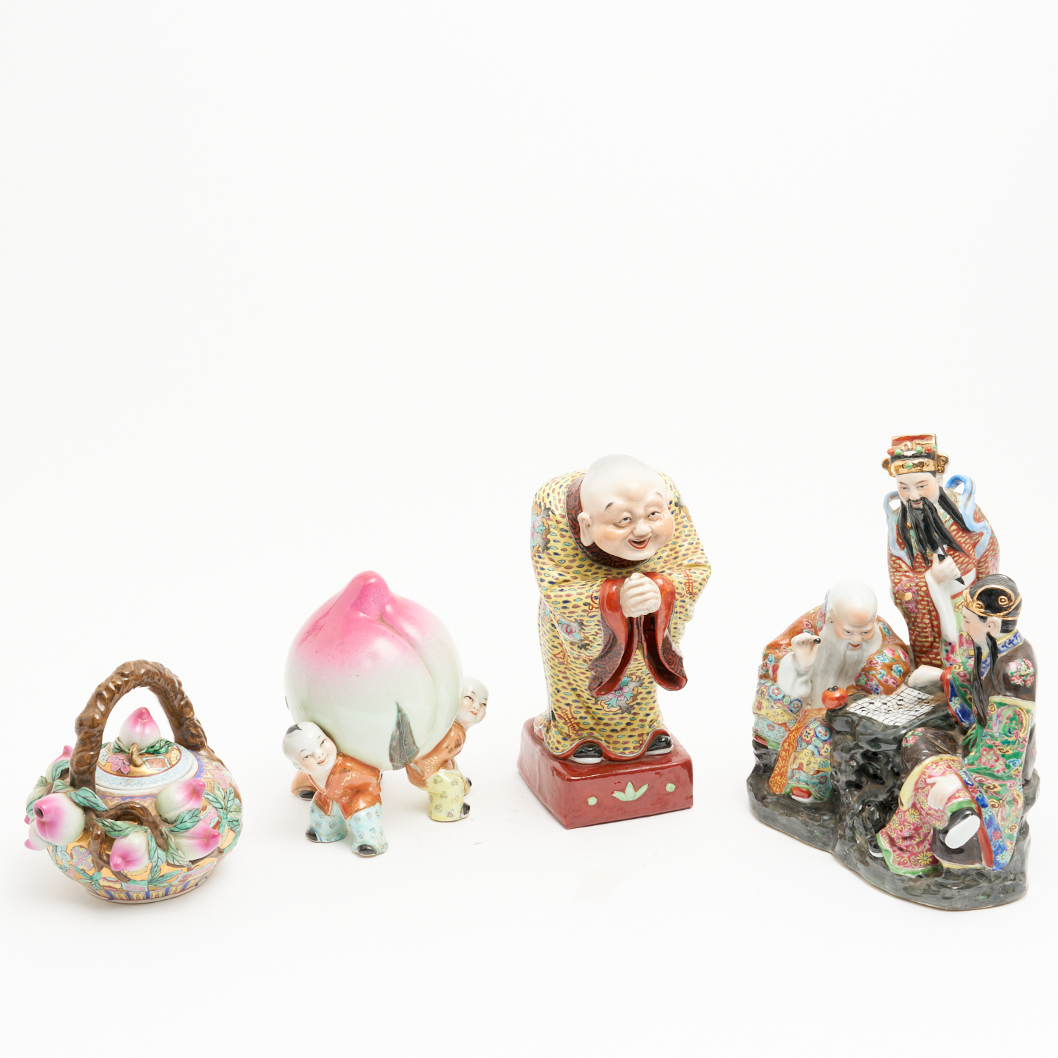 A GROUP OF CHINESE PORCELAIN FIGURES INCLUDING THREE IMMORTALS PLAYING DRAFTS, A BUDDHIST FIGURE, AND PEACH ADORNED TEAPOT AND AN OVERSIZE PEACH H.33CM (TALLEST)