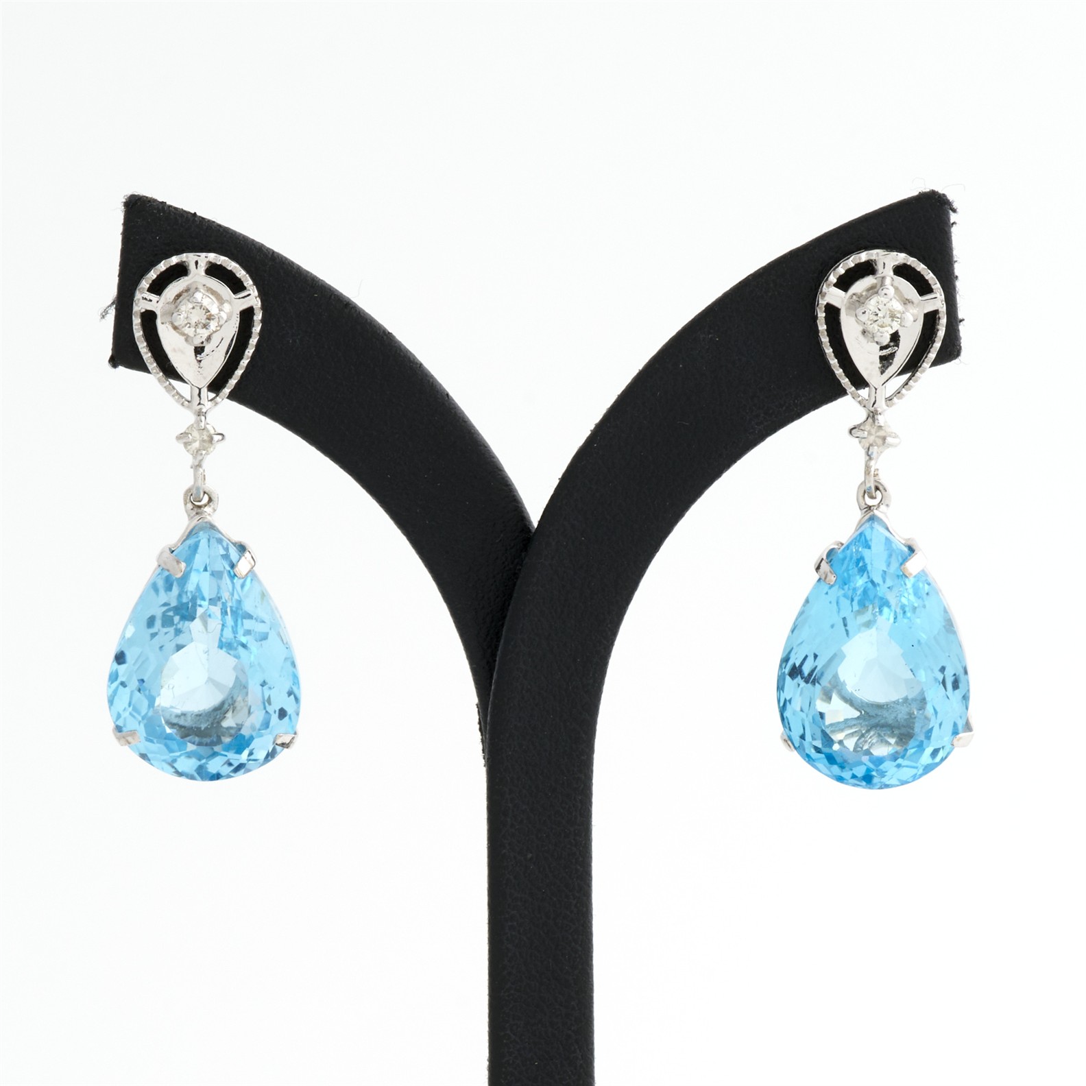 A PAIR OF BLUE TOPAZ AND DIAMOND EARRINGS IN 18CT WHITE GOLD, TO POST AND BUTTERFLY FITTINGS, THE TOPAZ WEIGHING APPROXIMATELY 35.38CTS, 40MM