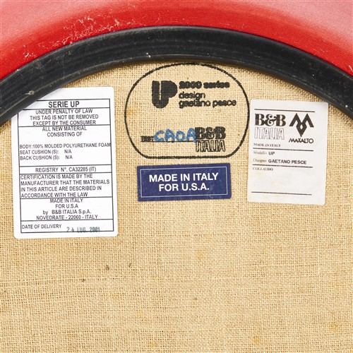 Scaled down childs version of the UP1 chair. Sculptural organic form in foam with red stretch upholstery. Manufacturer mark to underside.