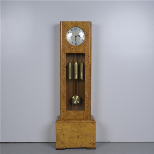 AN ART DECO BURR MAPLE CLOCK BY ENFIELD (191CM H X 60CM W X 33CM D) (THIS ITEM MUST BE REMOVED BY PROFESSIONAL CARRIERS OR CLIENTS. LEONARD JOEL STAFF CANNOT ASSIST WITH CARRYING OR DELIVERY OF THIS ITEM)