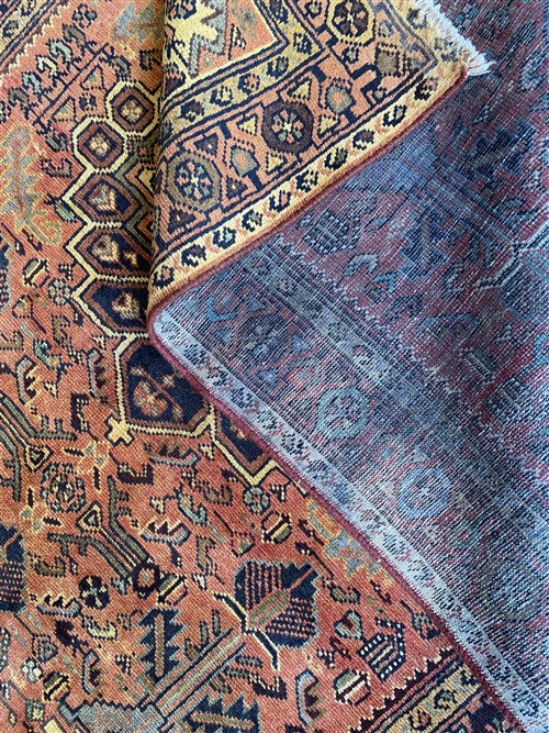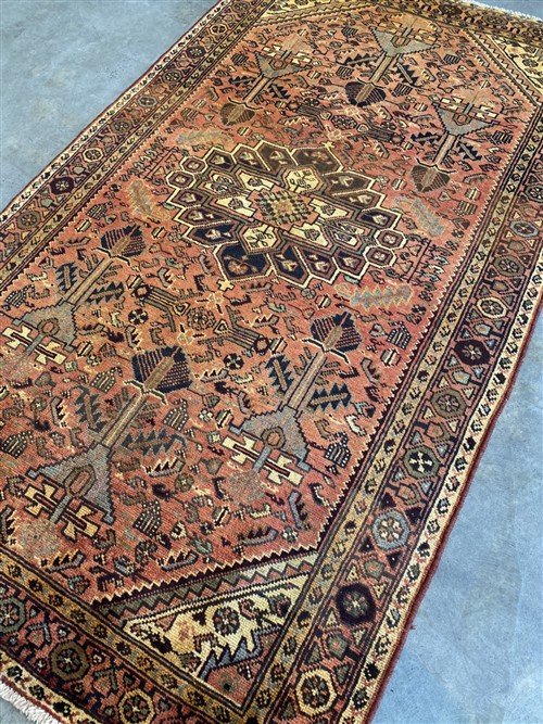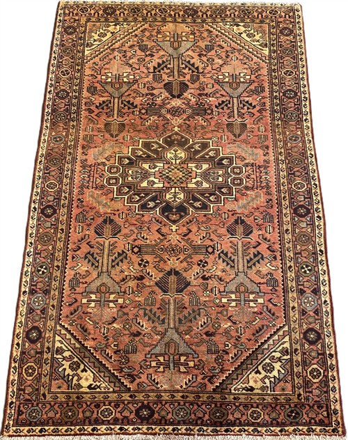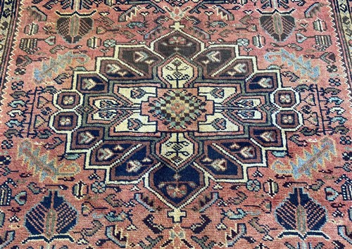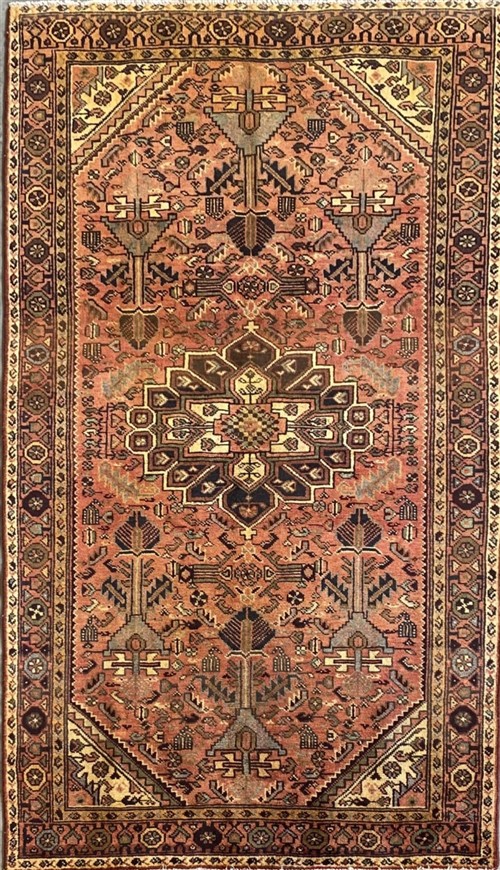 WOOL PILE & VEGETABLE DYES. VILLAGE WEAVE FROM THE HAMADAN REGION WITH DESIGN OF A STYLIZED MEDALLION IN A FIELD OF BOLD HERATI-MAHI PATTERNS & INTRICATE FLORAL & PAISLEY MOTIFS. BORDER OF ROSETTES. THE ENTIRE IN SUBTLE SHADES.