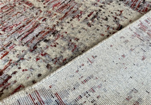 WOOL & BAMBOO SILK WITH VERTICAL DISTRESSED & EMBOSSED LINEAR PATTERNS. THE ENTIRE IN SHADES OF BEIGE, GREY WITH BURGUNDY HIGHLIGHTS.