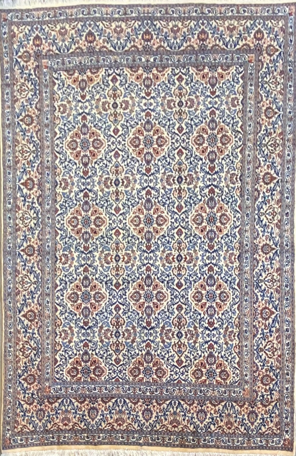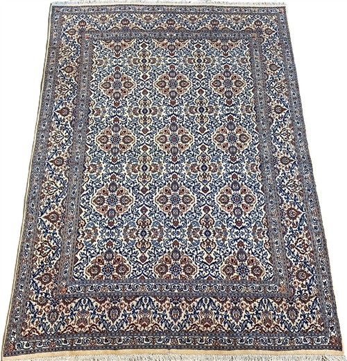 WOOLLEN PILE. FINELY HAND-KNOTTED WEAVE OF APPROXIMATELY 350,000 KNOTS PER SQUARE METER FROM THE NORTH-EASTERN KHORASAN PROVINCE WITH A UNIQUE MINA KHANI DESIGN OF ALL-OVER FLORAL SPRAYS OF PALMETTES IN A FIELD OF RAMBLING TENDRILS. THE ENTIRE IN SHADES OF CREAM, INDIGO, CERULEAN WITH BURGUNDY HIGHLIGHTS. EX-GALLERY EXHIBITED.
