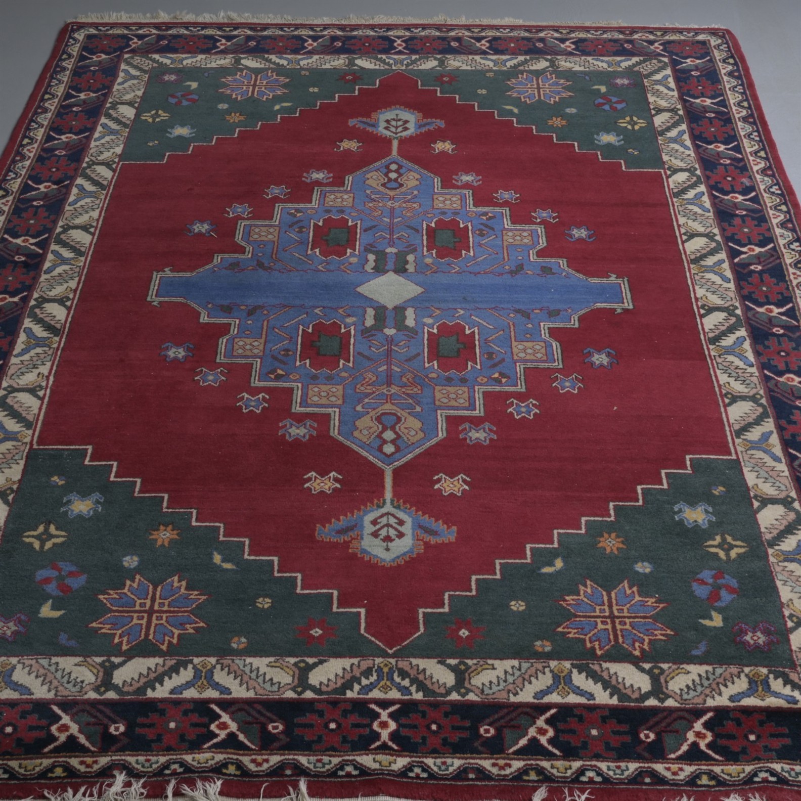 A PERSIAN WOOLLEN RUG (285CM L X 196CM W) (PLEASE NOTE THERE MAY BE SOME COLOUR VARIATION FROM PHOTOGRAPH)