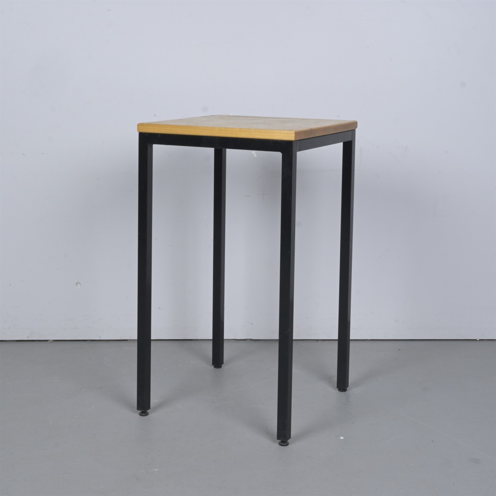 A SQUARE METAL AND HARDWOOD BAR TABLE (108CM H X 60CM W X 60CM D)