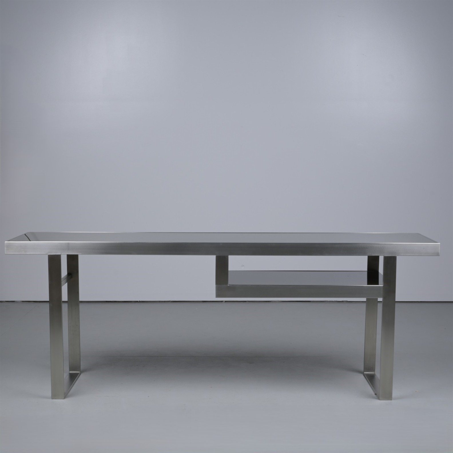 A MODERN STAINLESS STEEL AND SMOKED GLASS CONSOLE (76CM H X 202CM W X 45CM D)