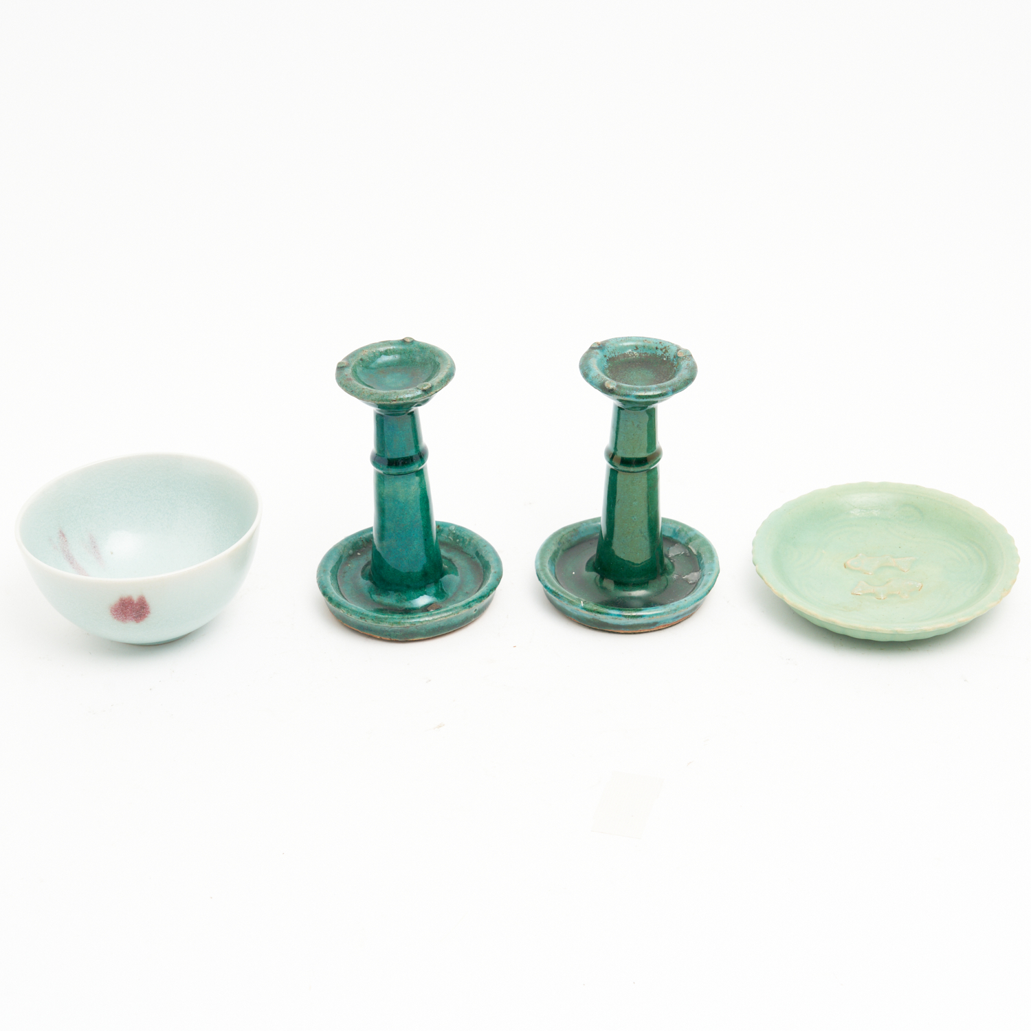 A SMALL JUN STYLE PURPLE SPLASH BOWL, TOGETHER WITH A GREEN GLAZED DISH AND A PAIR OF GREEN GLAZED CANDLESTICKS DIA.15CM (LARGEST)