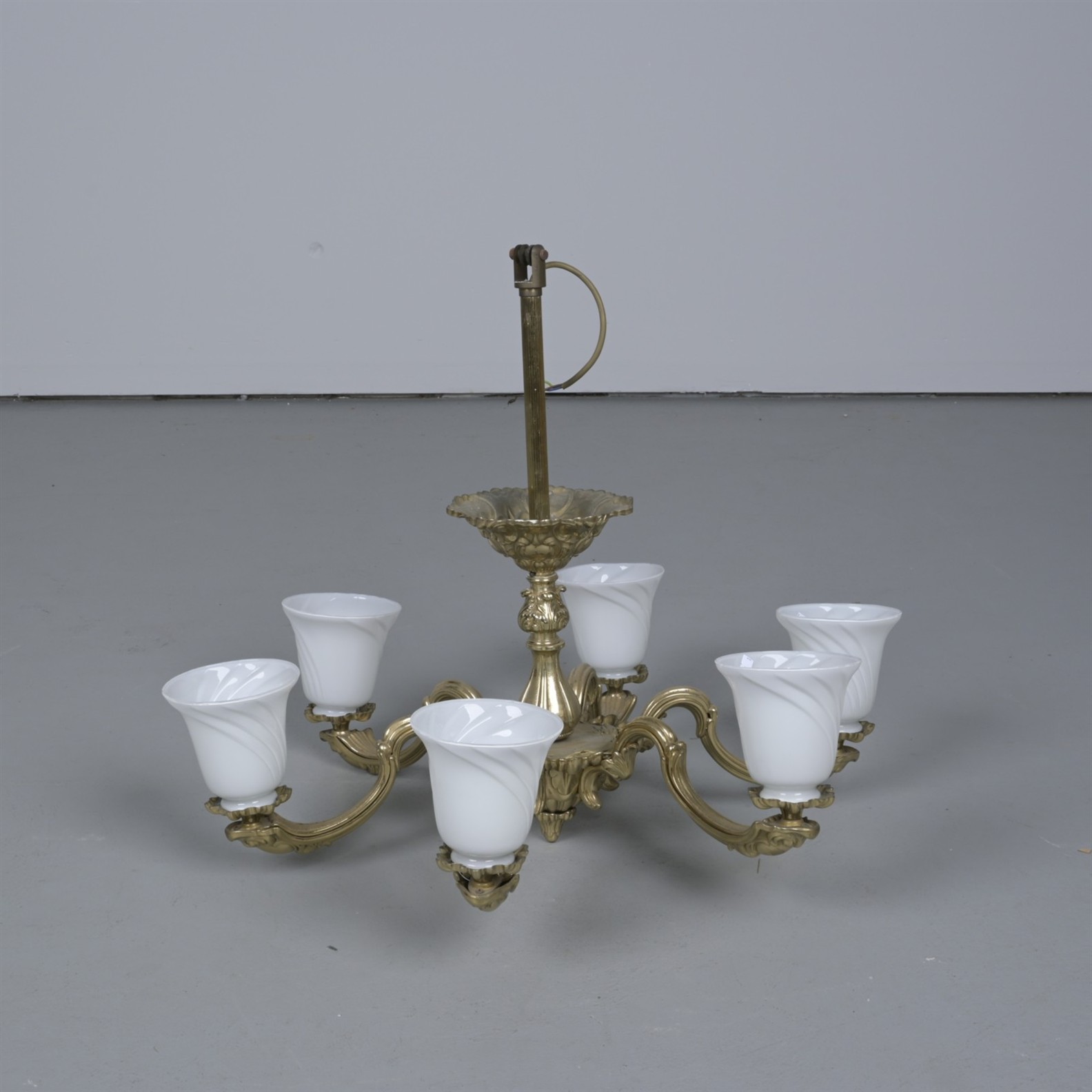 A BRASS AND MILK GLASS SIX-LIGHT CHANDELIER (62CM H X 72CM DIA)