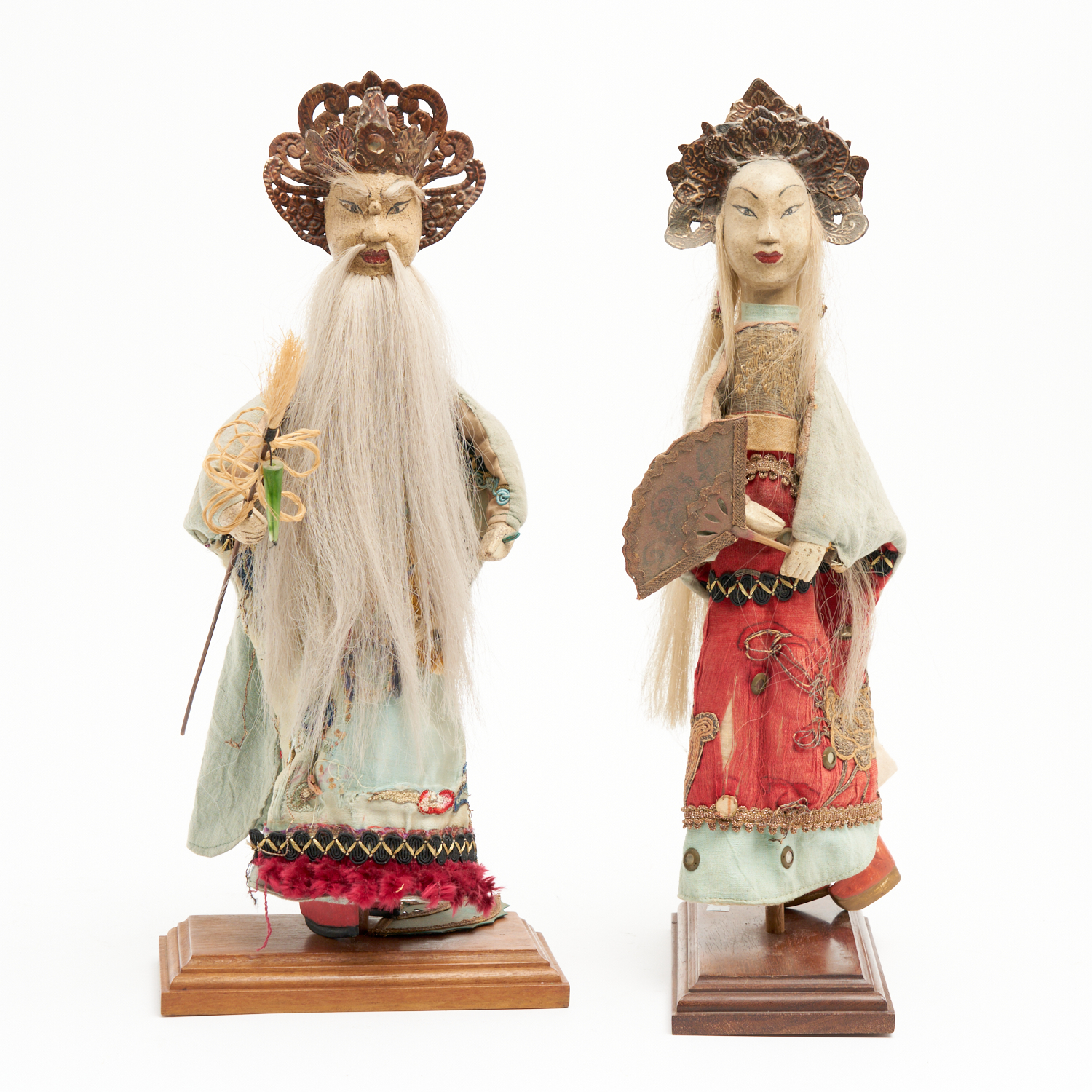 TWO HAND CARVED PUPPETS WITH COPPER HEADDRESSES, ON FITTED STANDS (A/F) H.49CM