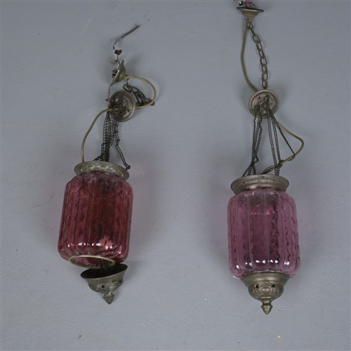 TWO VICTORIAN-STYLE PINK GLASS PENDANT LIGHTS (100CM H)