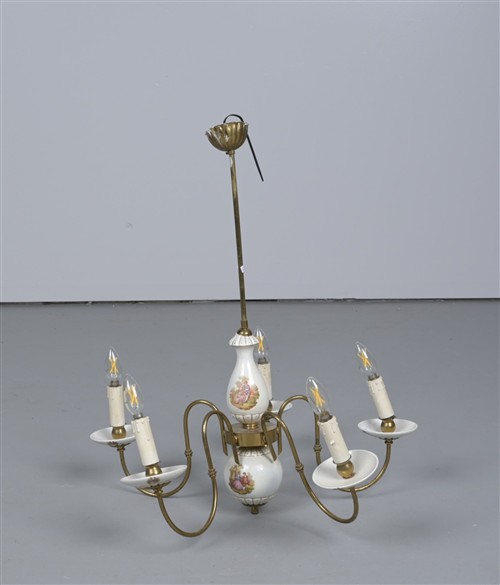 A VICTORIAN PORCELAIN AND BRASS FIVE-LIGHT CHANDELIER (76CM H X 65CM DIA)