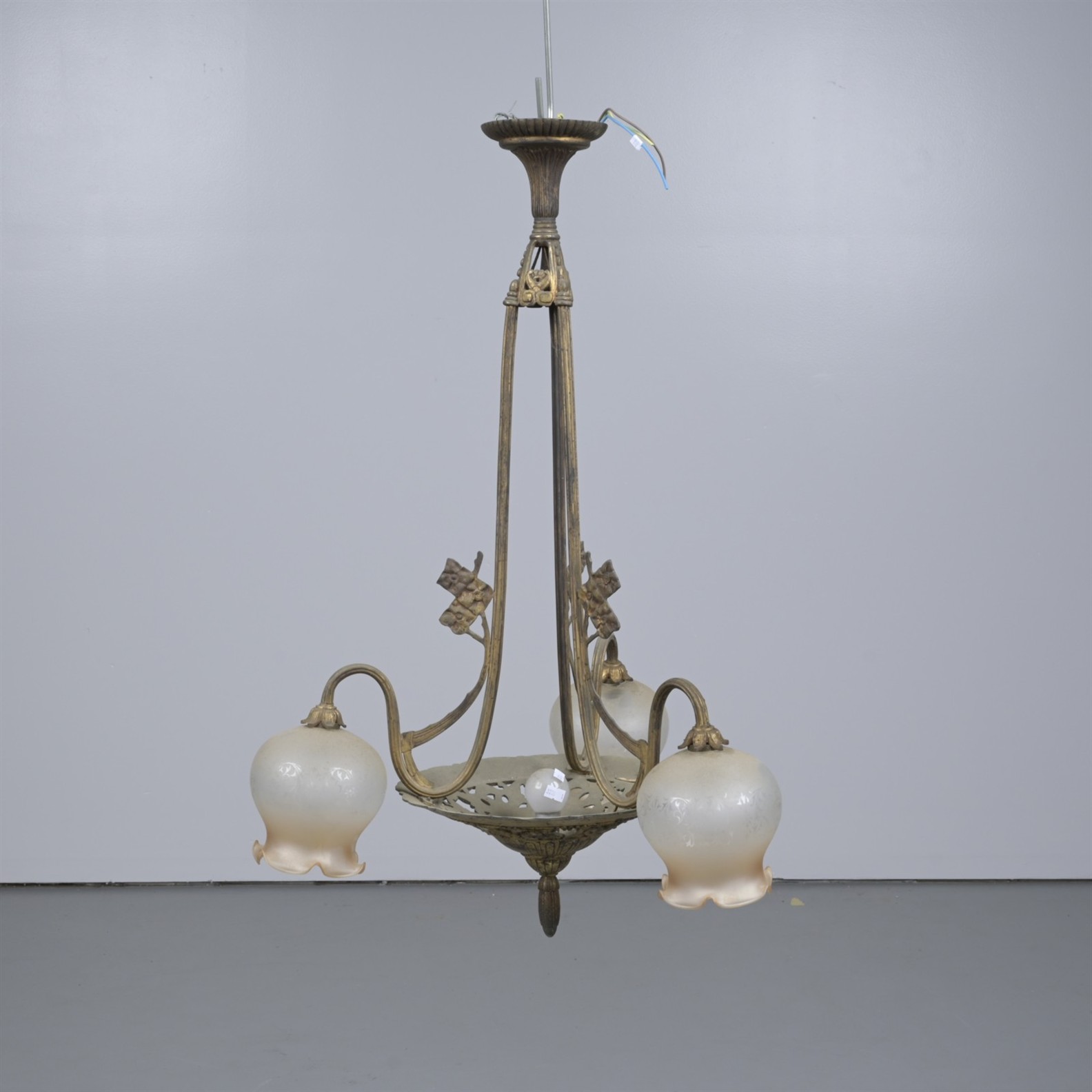 A METAL AND GLASS CHANDELIER (77CM H X 48CM DIA)