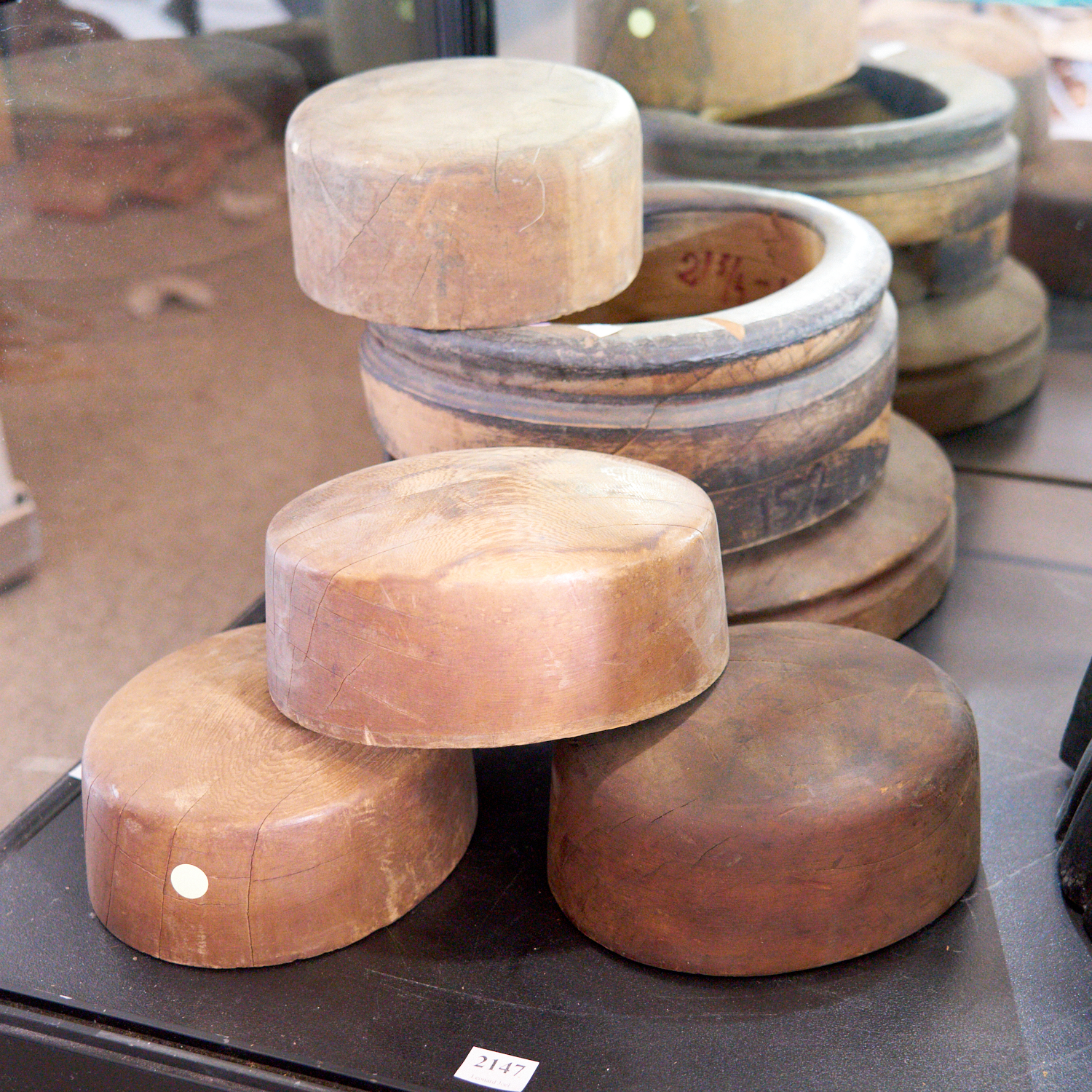 A COLLECTION OF FOUR VINTAGE HAT BLOCKS AND TWO RIM MOULDS DIA.28CM (LARGEST)