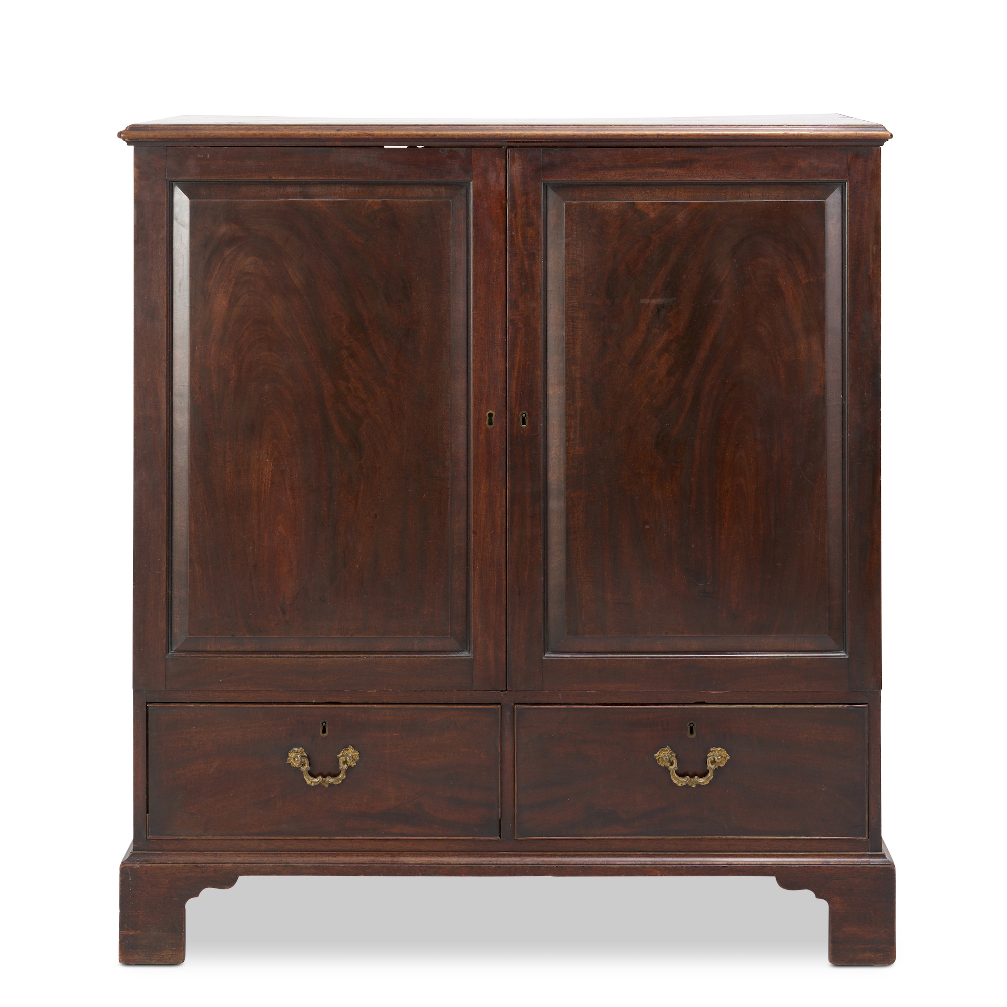 Rectangular, the top with moulded edge above a pair of doors with fielded panels enclosing three original sliding trays, a pair of drawers below, on bracket feet, the drawers retaining their original gilt bronze pulls, the inner side of one door retaining an applied card inventory label with printed heading 'C.H.' followed by '41 / 1942' in pen and ink, a paper label to the back inscribed in ink 'Mr Howard's Bedroom'