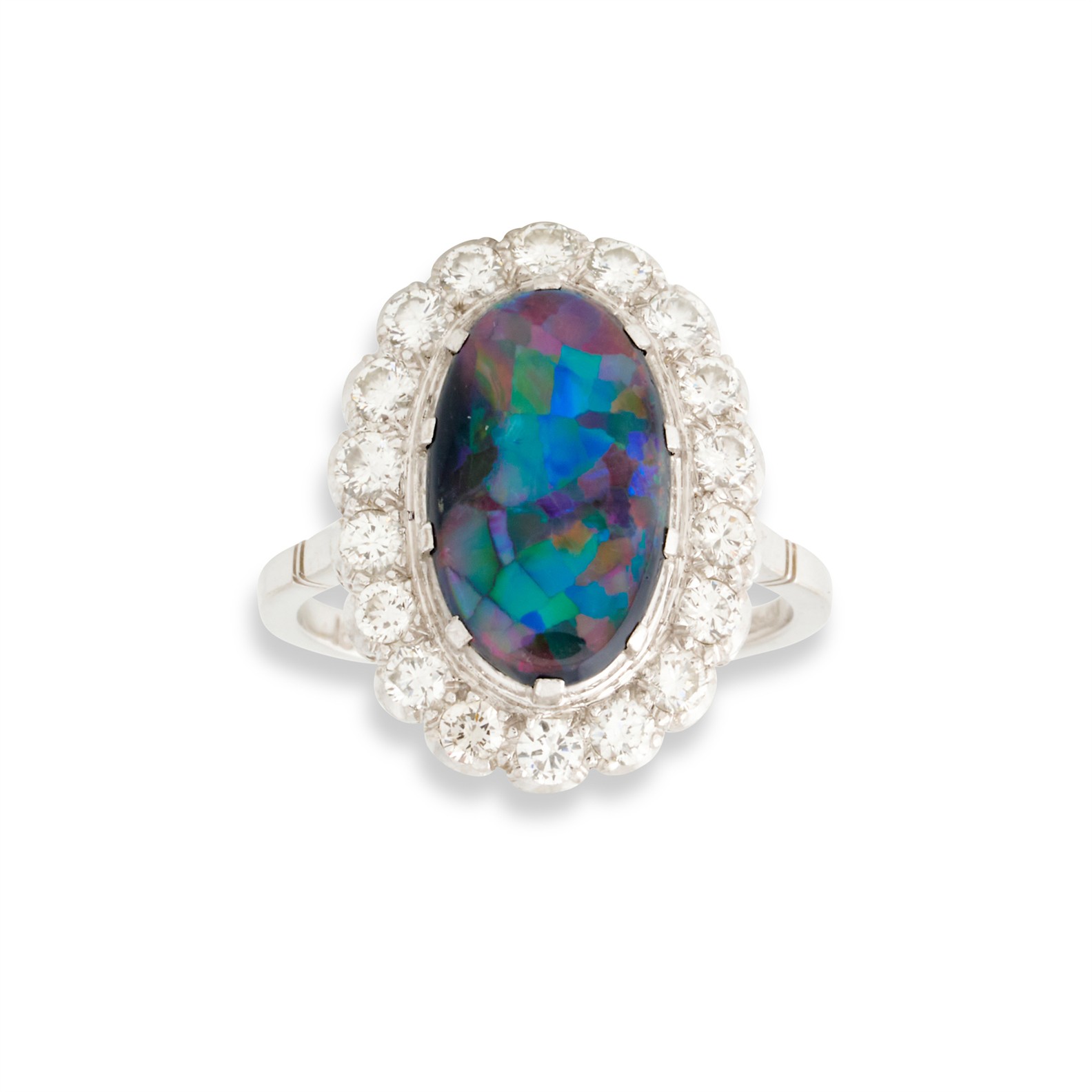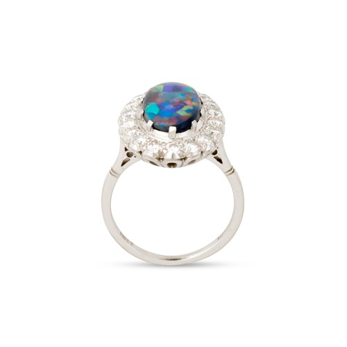 Of cluster design, centring a claw-set oval cabochon black opal measuring approximately 13mm x 8mm, framed by a halo of pavé-set brilliant-cut diamonds, the diamonds together weighing approximately 0.54 carats, mounted in 18ct white gold and platinum, size L1/2, gross weight approximately 4.4 grams.