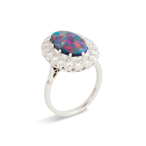 In our opinion, the black opal displays good play of colour, with flashes of red, orange, green and blue, minor scratch to the surface. The diamonds are bright and lively, probably of G-H colour and VS to SI clarity, as gauged and graded within the limitations of the cutting style and the mounting.