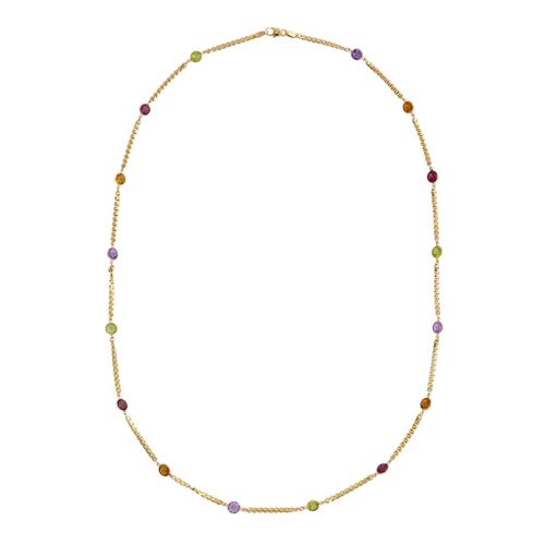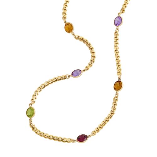 Designed as a continuous line of 16 spectacle-set circular-cut gemstones including citrine, amethyst, peridot and tourmaline, alternating between chain connectors, mounted in 9ct gold, inner circumference 690mm, gross weight approximately 12.7 grams.