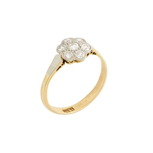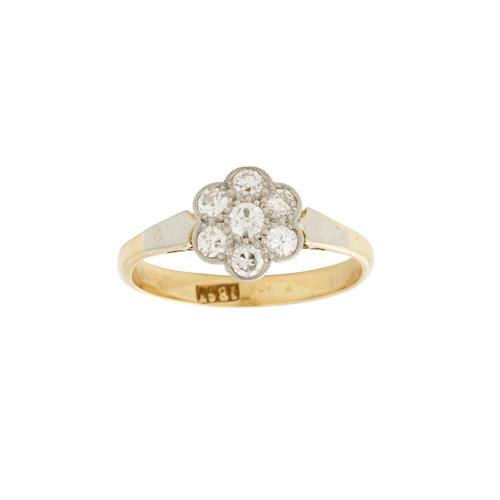 Of cluster design, centring a pavé-set early brilliant-cut diamond, framed by similar set early brilliant-cut diamonds, the diamonds together weighing approximately 0.42 carats, mounted in 18ct gold, size N, gross weight approximately 2.5 grams.