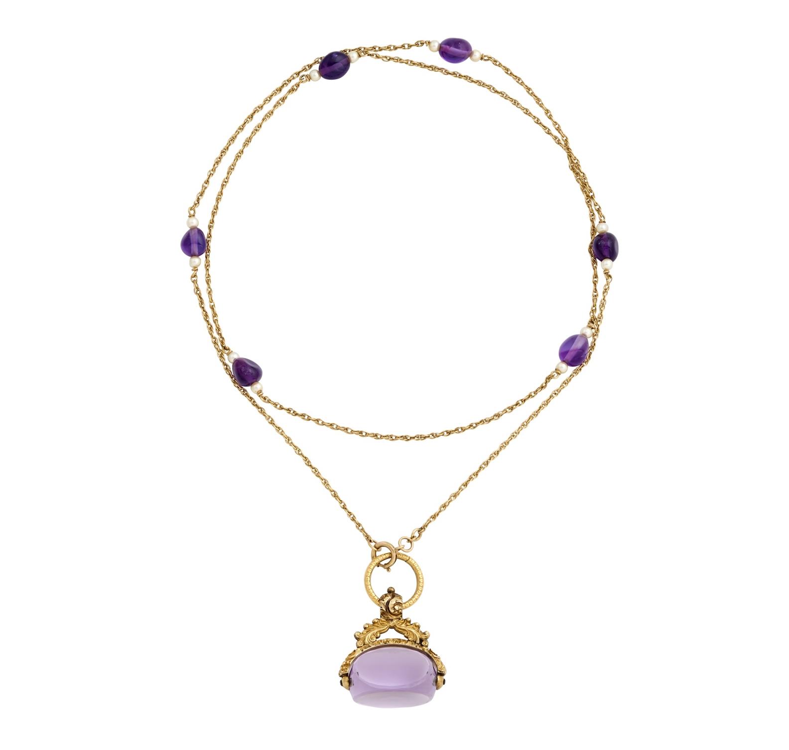 Centring an amethyst spinner fob, suspended from a rope chain, interspersed with pearls and tumbled amethyst beads, mounted in 9ct gold, pendant length 45mm, inner circumference 780mm, gross weight approximately 26.3 grams.
