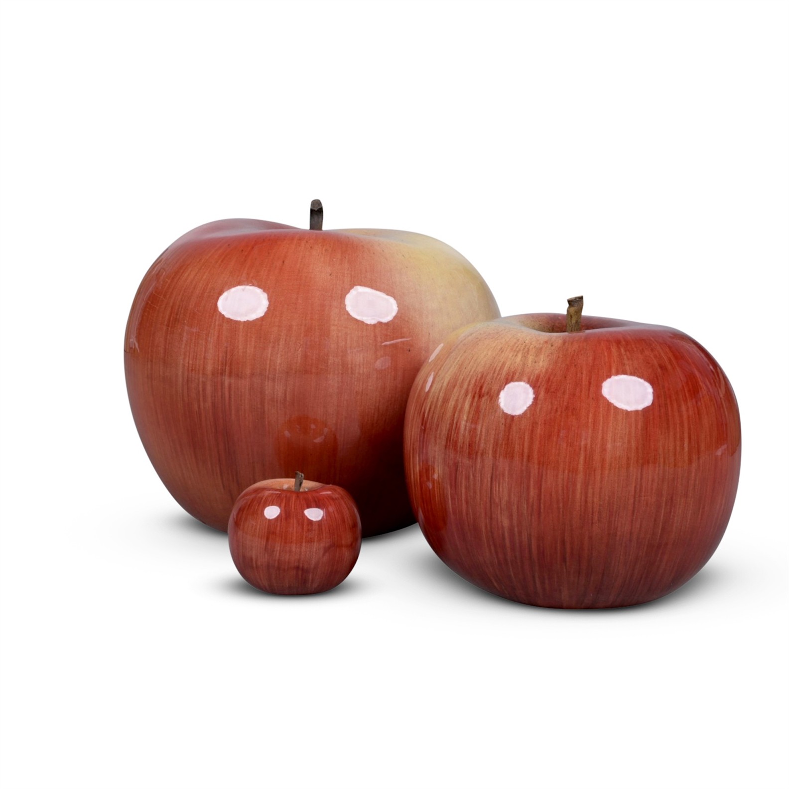 A GROUP OF THREE BULL & STEIN RED AND YELLOW APPLE CERAMIC SCULPTURES BY LISA PAPPON